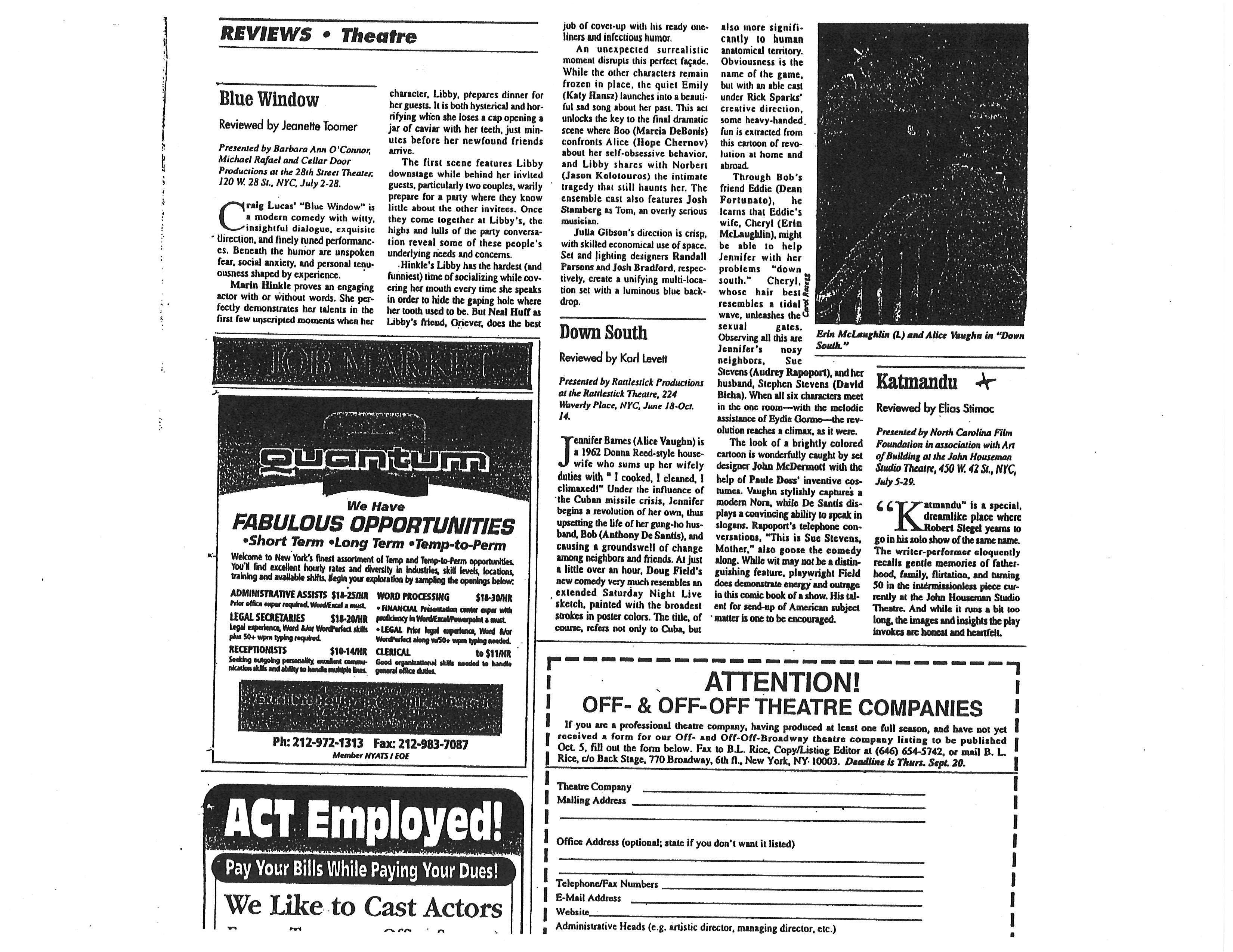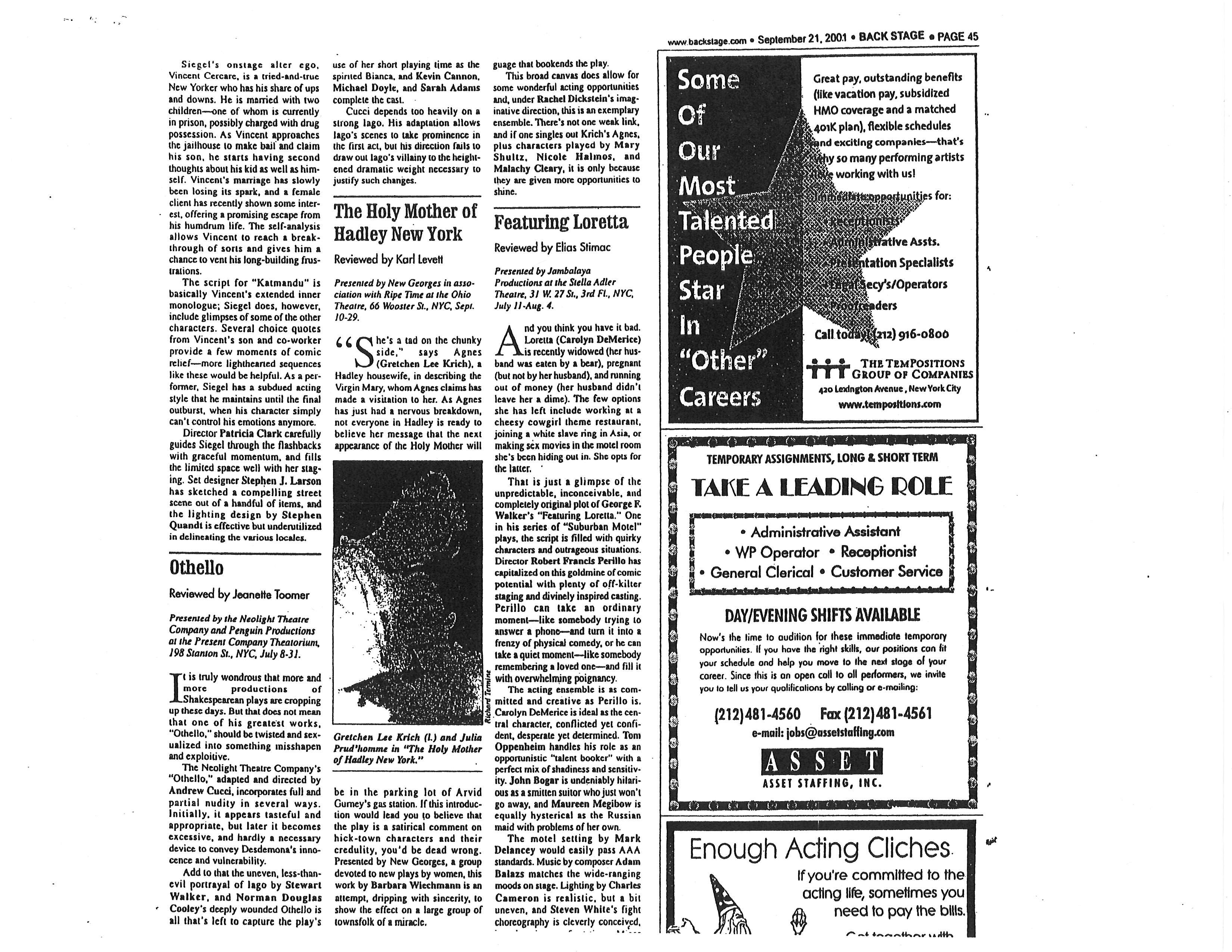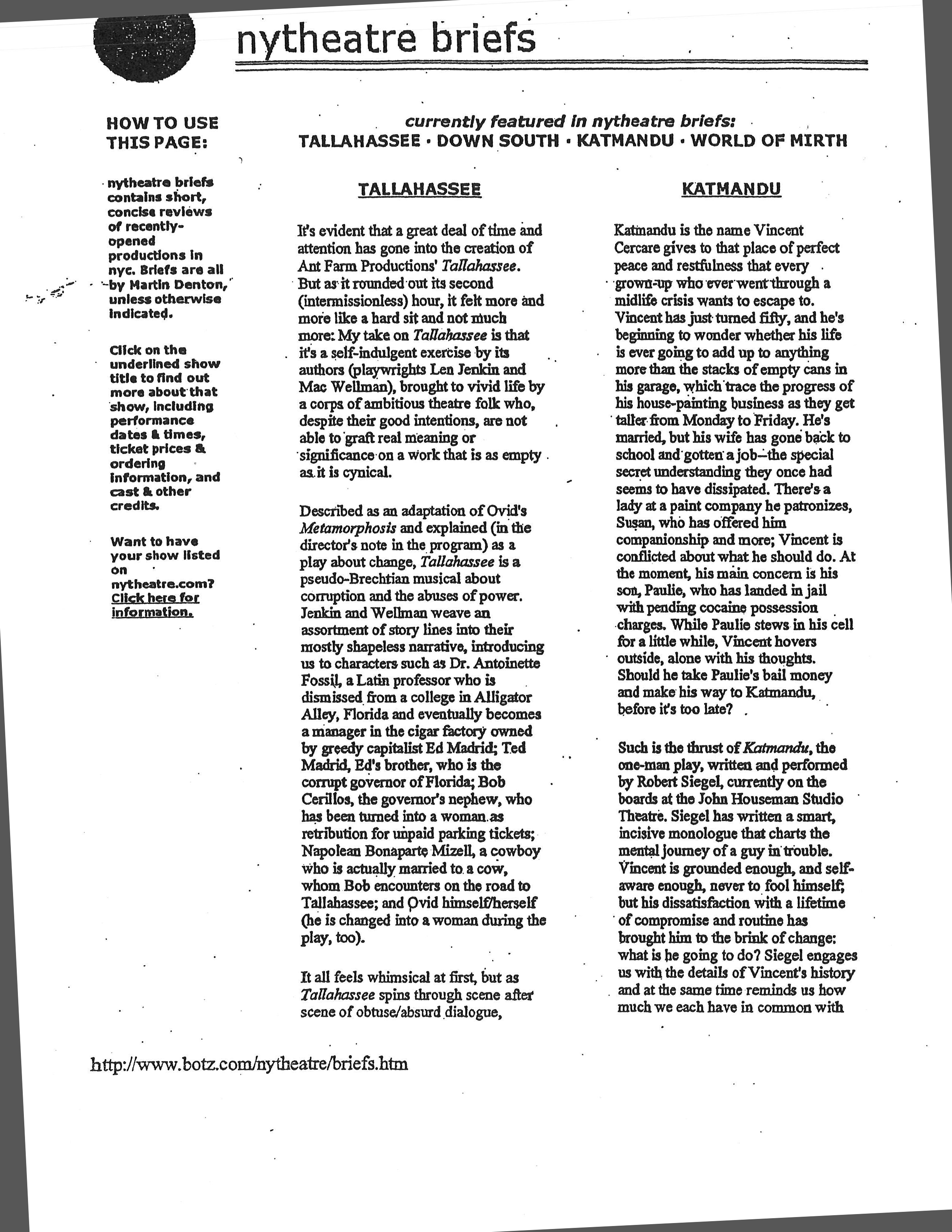 Vincent Cercare has turned the corner on fifty. He’s been thinking about running away from his routine and his family. On the night before he’s ready to take off, his son is arrested for possession of cocaine. The play unfolds across the street from the police station, where in the course of a very long night, Vince tries to come to terms with his son, his relationship with his own father, and his marriage. Part comedy, part drama, KATMANDU is a one-man play about a guy trying to understand who he is at a critical juncture in his life. One actor does all the roles, father, son, wife, etc. The play runs about seventy minutes without an intermission. A video excerpt is available on Vimeo (contact author for password).