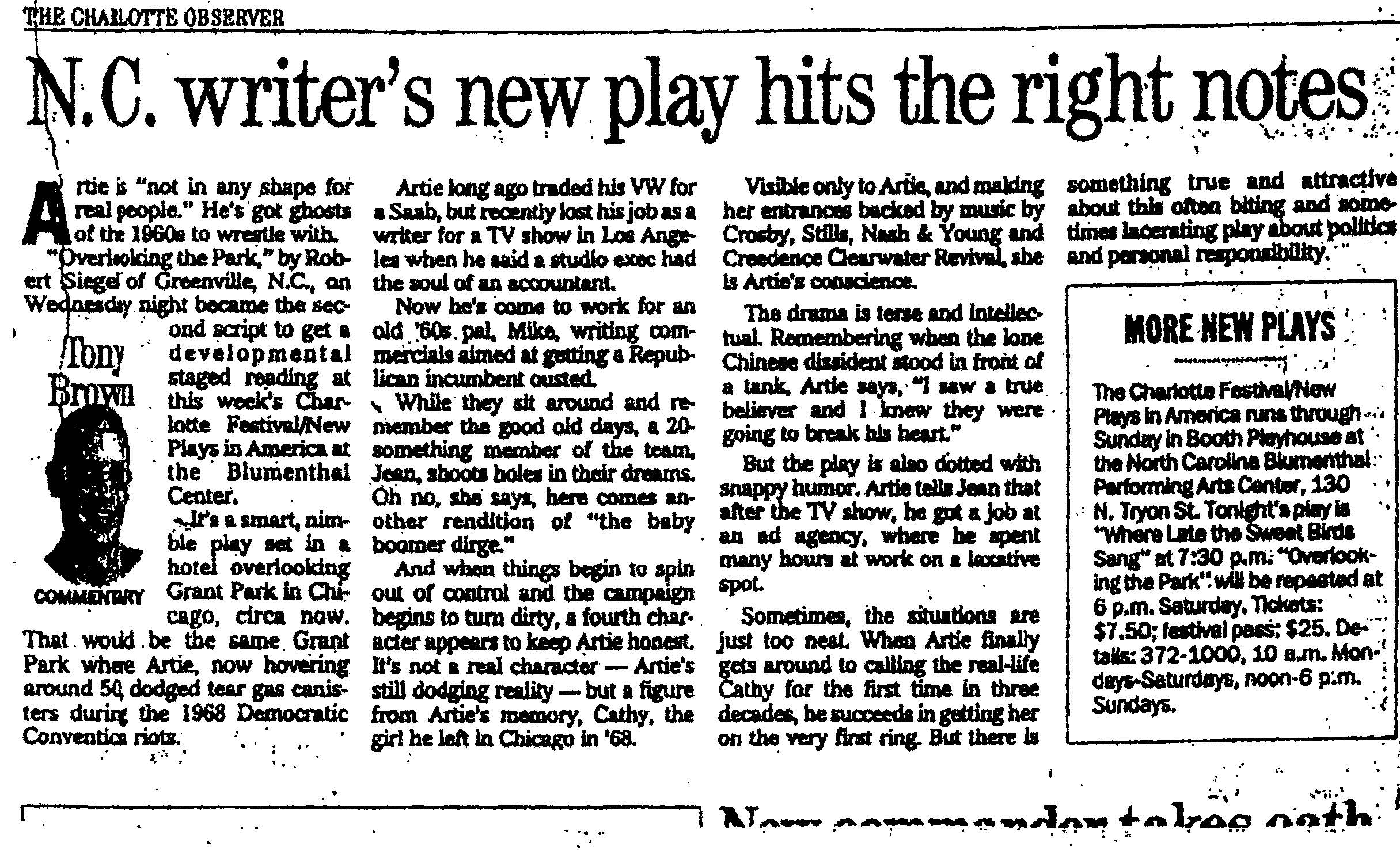 OVERLOOKING THE PARK examines the body politic from the perspective of image makers. It is somewhat expressionist in style. One of the characters, Artie’s first love, is a memory character who interacts with Artie. Through her the script explores the 1960’s and takes seriously the issues and perspective of that time. In addition to Artie’s old crony Mike, who is now his boss on this media team, there is a young woman Jean who has worked hard to reach her position of responsibility. She provides an intelligent counterpoint to Artie, a generational conflict that is another layer of the play. The heart of this story is about someone with his back to the wall trying to figure out where to draw the line.