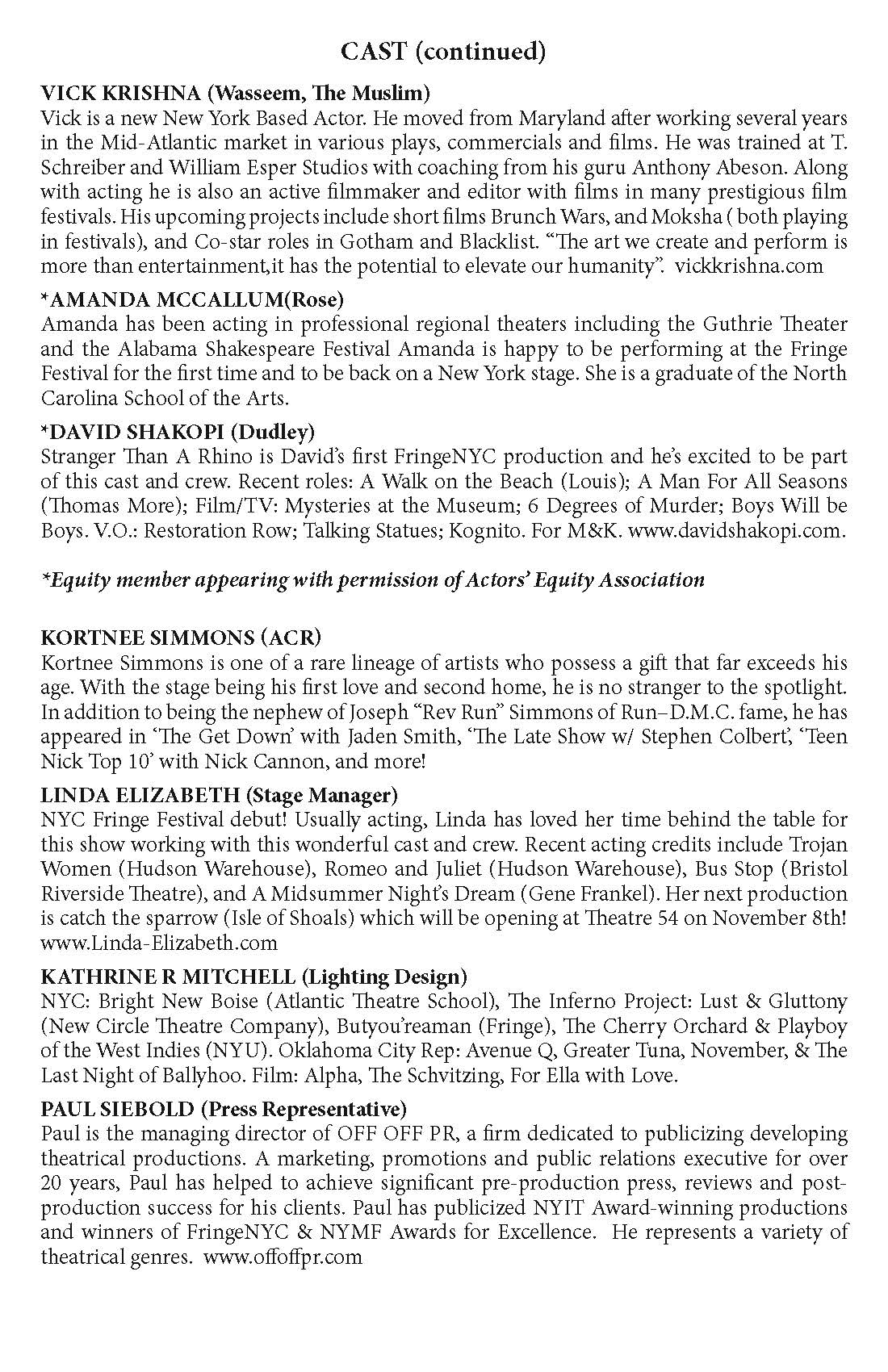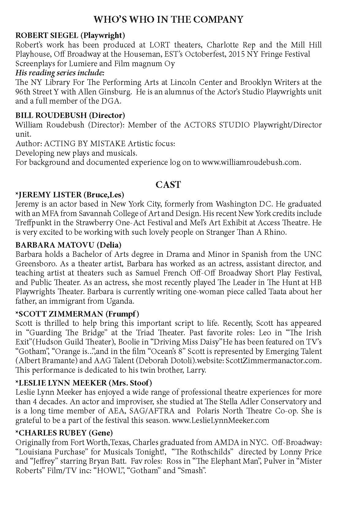 A director with a reputation for restaging classics takes on Ionesco’s Rhinoceros making a crucial change to reflect current societal fears. A neophyte lands the role of the protagonist. Another cast member begins to wonder about his stake in this play. As rehearsals progress and the new Rhino emerges, the tension between cast and the play, especially our mysterious neophyte, brings the play to a startling conclusion about our recent past.